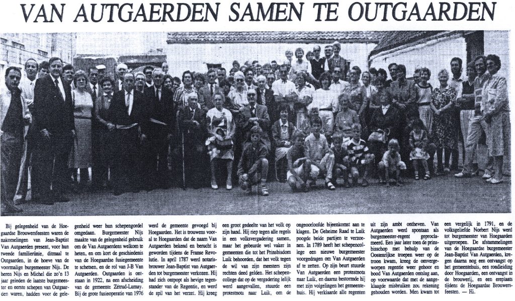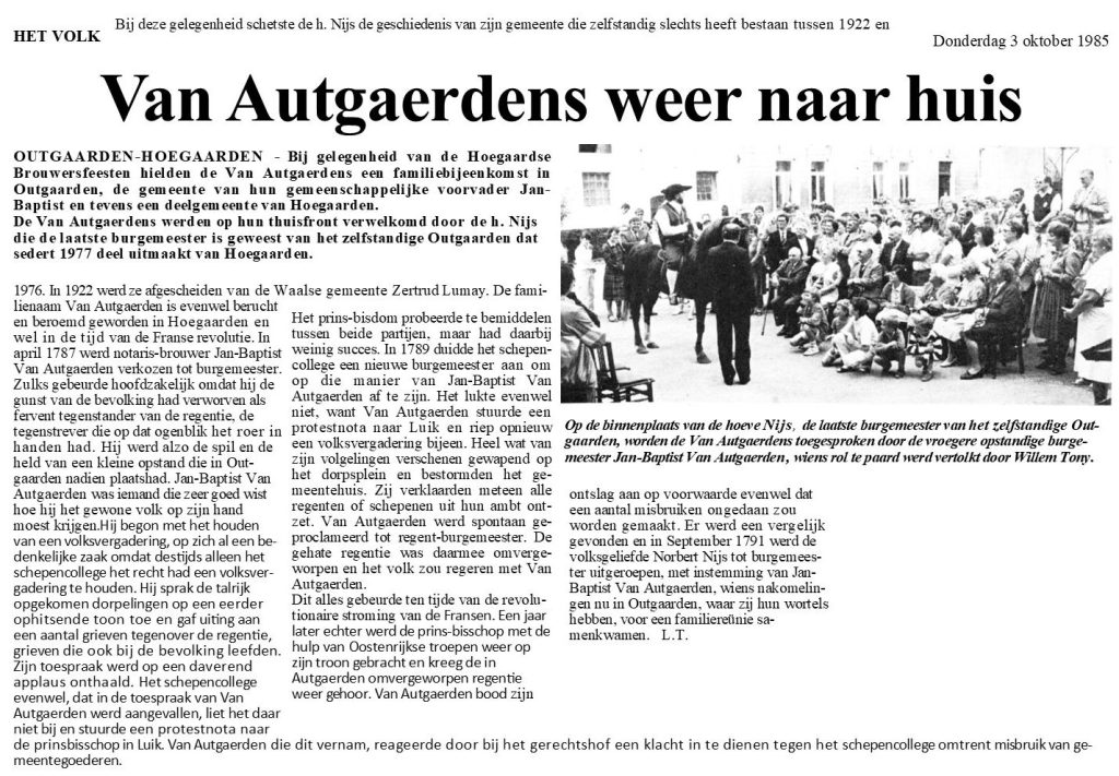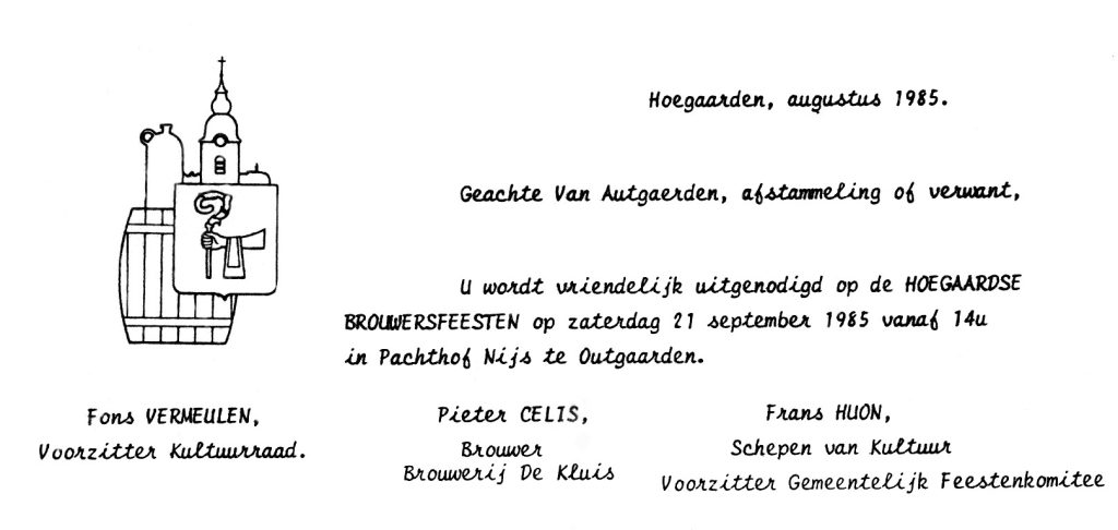 In 1985 zullen de afstammelingen van Van Autgaerden opnieuw bezitnemen van Hoegaarden. Met honderden komen ze, naar men hoopt vredelievend, straten en pleinen innemen. Ze zijn in staat de brouwerij te bestormen tot op de bovenste verdieping. Een rehabilitatie is hen echter gegund, de Van Autgaerdens mogen ook in de sporthal tijdens de brouwersfeesten een ereplaats bekleden. In elk geval worden alle nakomelingen van pachter Jan Van Autgaerden (Hoegaarden, 1516) te Hoegaarden verwacht in september 1985. Een hele reeks eerbiedwaardige brouwers en maalders drukten een blijvende stempel op de dorpsontwikkeling. Leden van deze grote familie komen hun wortels zoeken aan de Grote Gete en de Paanhuisbeek. Hun viering start te Outgaarden om 14 uur. Daarna volgt een dorpsbezoek, rondleiding in monumenten en de brouwerij … tot in in de sporthal het weerzien met de verre familieleden-Hoegardiers uitbundig zal worden gevierd.