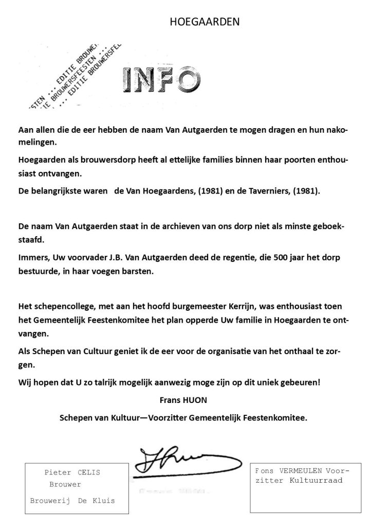 Nakomelingen van J.B. Van Autgaerden en andere naamgenoten zullen op 21 september Hoegaarden overrompelen. Hun oproep dienaangaande laat niets van hun bedoelingen onverhuld. Zij zullen de plaats opeisen die hen toekomt.