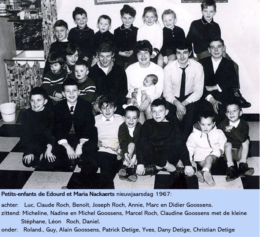 Aankomst in 1954 op de citadel van Dinant met vlnr: Raymond Gooosens en dochter Claudine (3j), Nelly met dochter Nadine, (1j), Agnes (16j) en Edouard (50j), achteraan Georges(12j) en Bernard 14j). (digitaal ingekleurde foto)