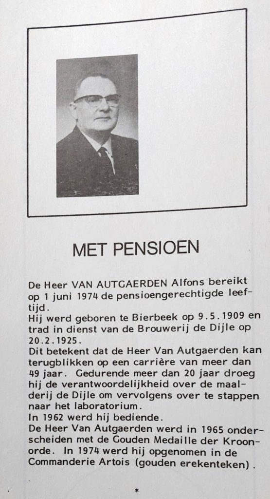 Zeer jong – U was maar 15 jaar – hebt U in onze onderneming uw intrede gedaan langs de poort van de Brouwerij DE DYLE, de “Leuvense Kam” genoemd. Dat was in 1925 en U was eigenlijk gekomen om uw broer Edouard te vervangen tijdens zijn militaire dienst.