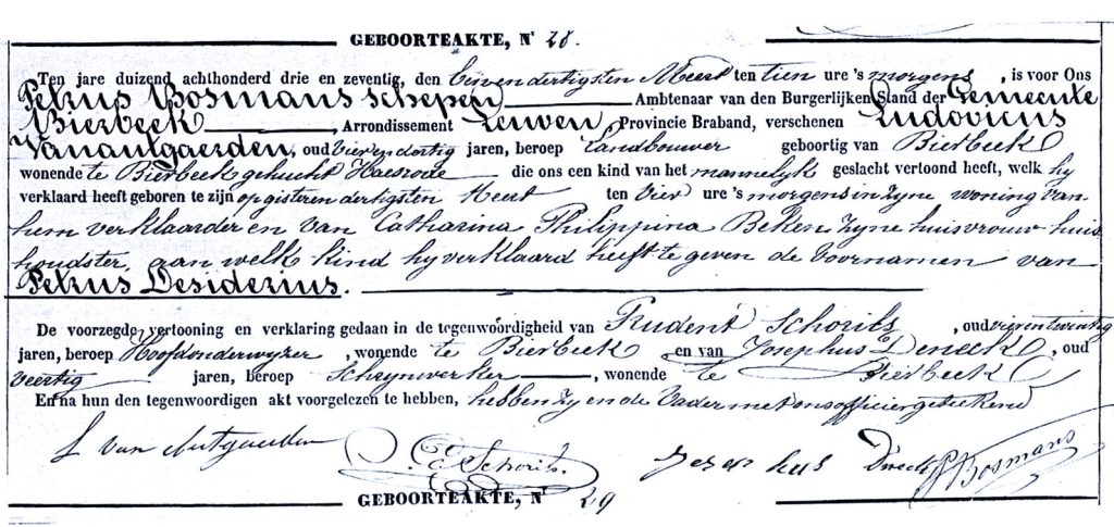 Geboorteakte Petrus Desiderius 1873, 31 maart