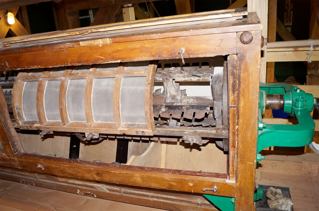 Door een vernuftig systeem van houten tandwielen onder de molenstoel, en de nodige houten raderwielen en riemen kunnen de twee molenstenen, de graanelevator, de builmachine en de zakkenheffers tegelijkertijd of afzonderlijk bediend worden.