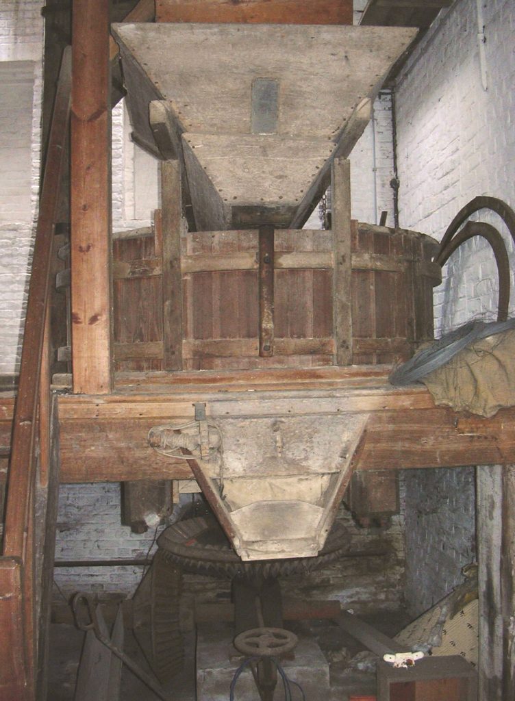 Schuddebak en opvangtrechter voor het meel (foto molen Lovenjoel).