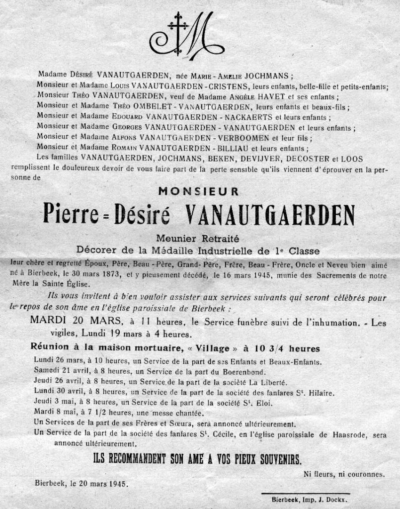overlijdensbericht Van Petrus Désiré. Geen nederlandstalige in ons bezit.